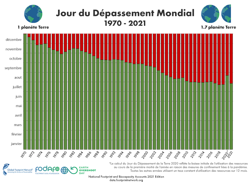 La date du jour du dépassement est calculée depuis 1970. Cette année-là, elle avait été établie au 30 décembre. Depuis lors, le déficit écologique se creuse chaque année et la date estimée est de plus en plus hâtive : 4 novembre en 1980, 10 octobre en 1990, 22 septembre en 2000, 6 août en 2010.