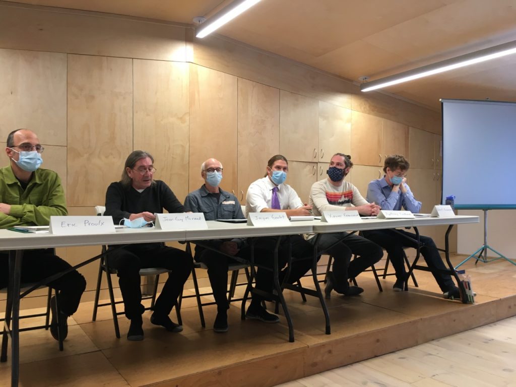 Des membres de la Coalition pour la préservation du Parc récréoforestier de Saint-Mathieu-du-Parc font valoir les raisons qui soutiennent l’adoption d’un moratoire sur les coupes forestières. Photo : Stéphanie Dufresne